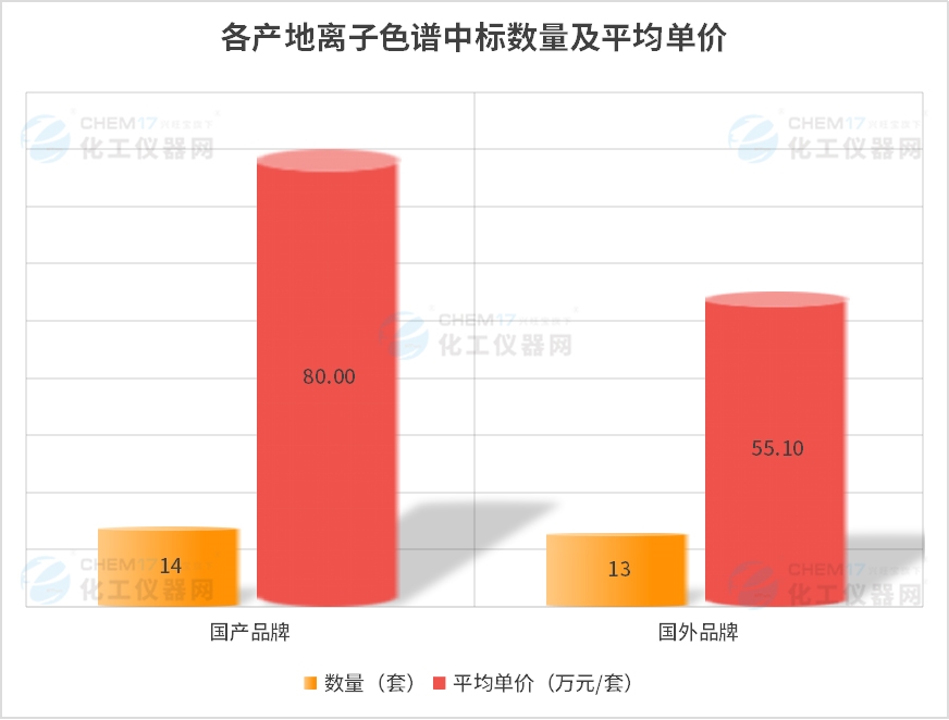 從“各產(chǎn)地離子色譜中標(biāo)數(shù)量及平均單價”來看,9月國產(chǎn)品牌離子色譜儀的中標(biāo)數(shù)量為14套,約占9月份離子色譜儀中標(biāo)總數(shù)量的51.85%,平均中標(biāo)單價約為80萬元/套;國外品牌離子色譜儀的中標(biāo)數(shù)量為13套,約占9月份離子色譜儀中標(biāo)總數(shù)量的48.15%,平均中標(biāo)單價約為55.10萬元/套。