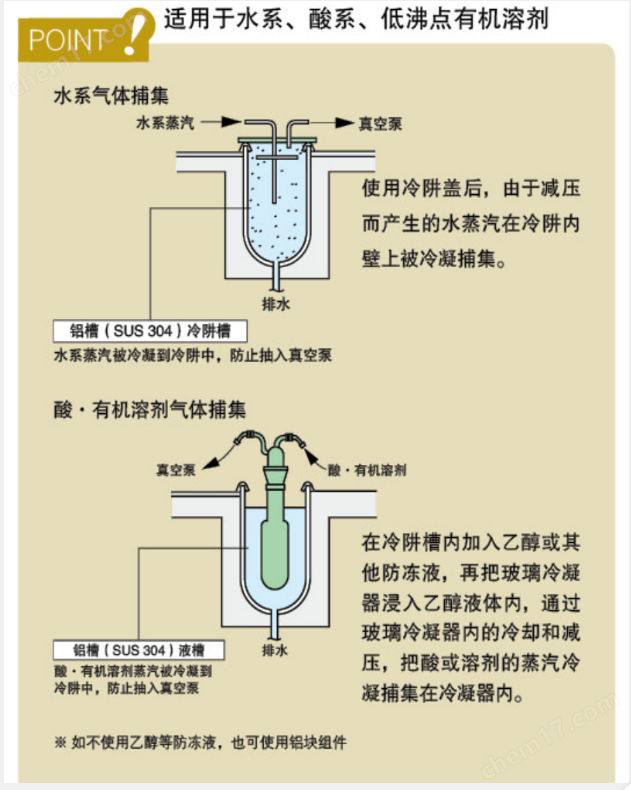 1、 可以捕集從真空干燥箱或者減壓濃縮裝置中排放出的水蒸氣及有害氣體,提高真空系統(tǒng)的工作效率,大幅度減少真空泵的蒸氣吸入量,延長真空泵的使用壽命。