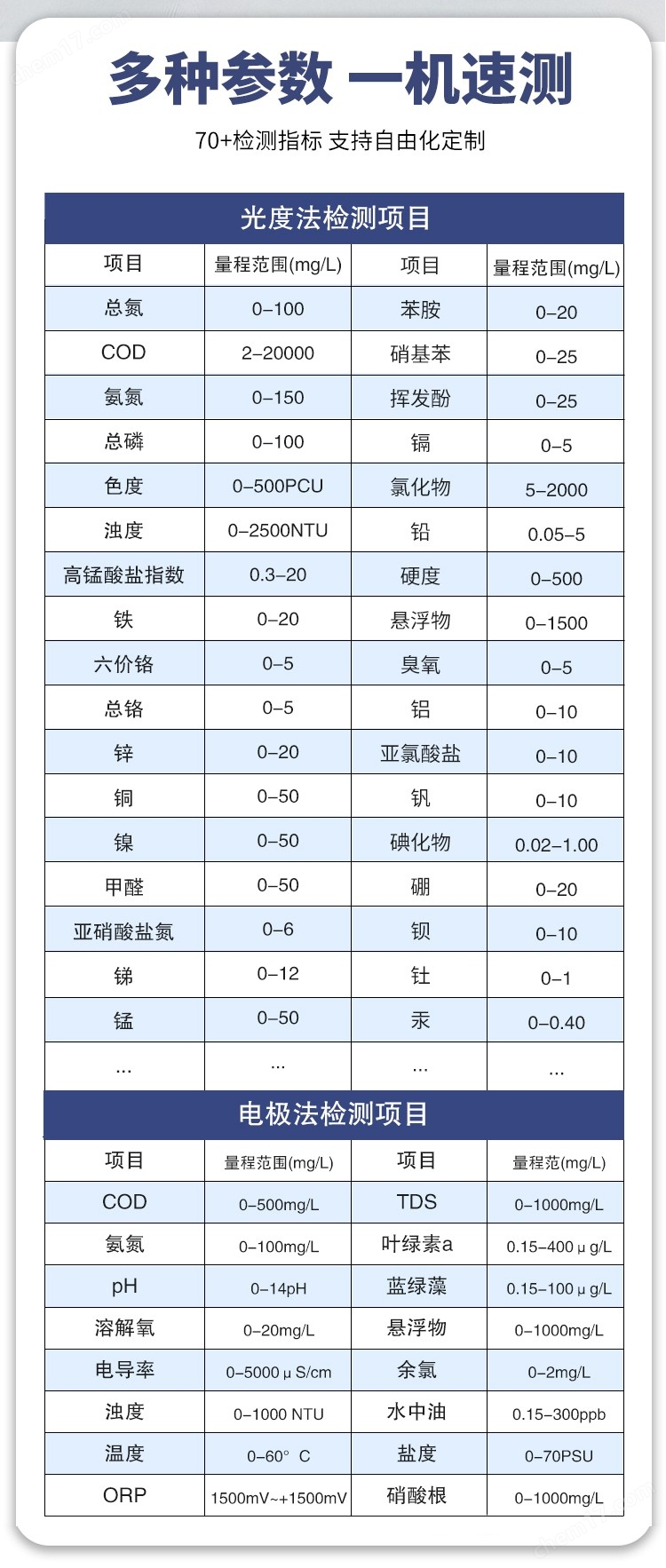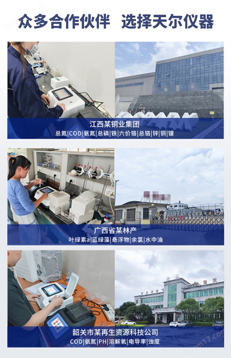 11. 可快速檢測水質中COD、氨氮、總磷、總氮、濁度、色度、重金屬、pH、溶解氧、電導率、ORP、葉綠素、TDS、水中油等百種項目,項目可自由組合,實現(xiàn)定制化服務;