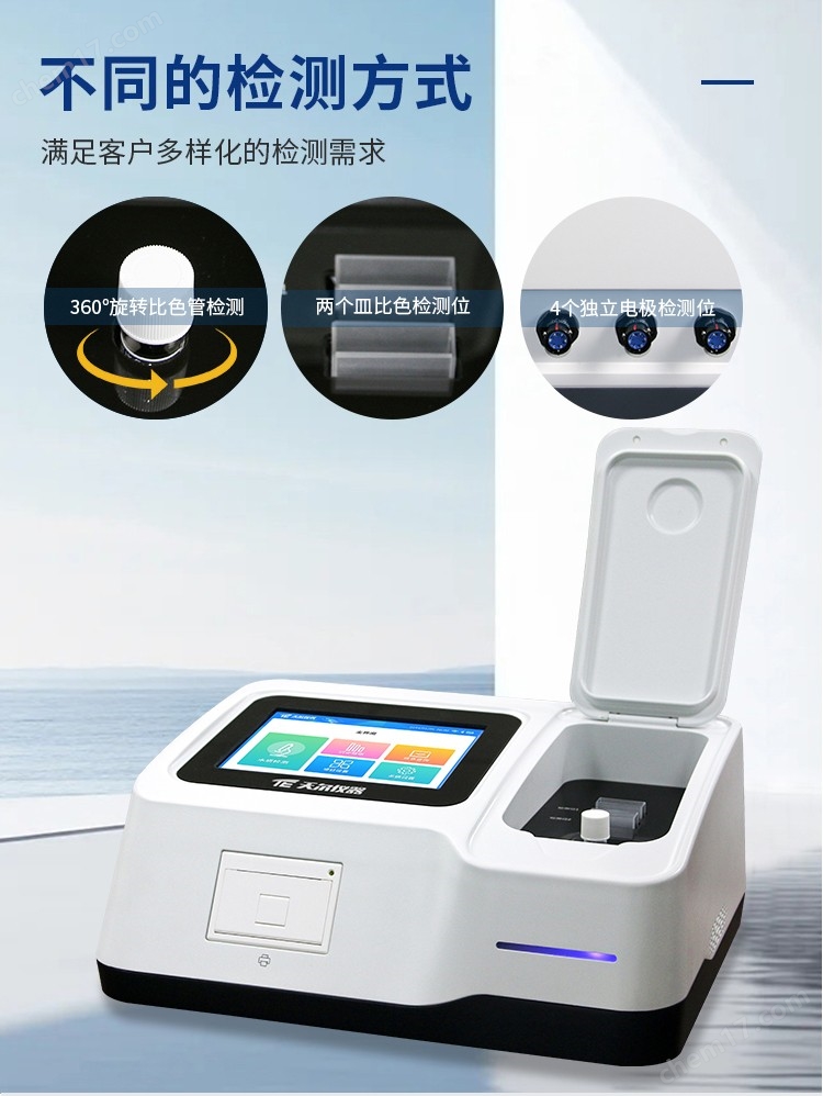 8. 檢測方式:360°旋轉比色管檢測、10mm/30mm比色皿檢測及高精度數(shù)字電極檢測
